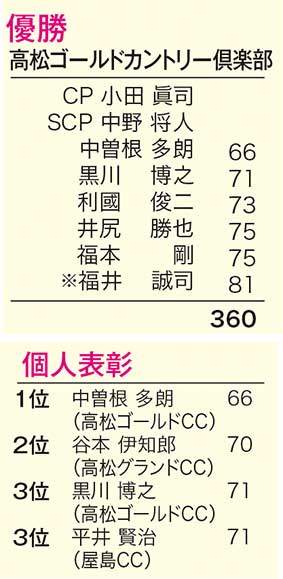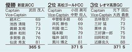 1位は「高松ゴールドカントリー倶楽部」が2位に30ストロークの大差にて初の1位通過で上位5名の平均スコアは72という圧勝でした。個人の部も同倶楽部の中曽根多朗さんが6アンダーの66で個人1位の栄冠に輝きました。上位6チームが四国大会決勝に進出されます。