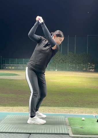 まず9番アイアンで通常のアドレスを作り、トップまで上げます。トップで完全に止まった状態を作り、左足を少し上げます。