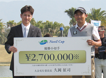 ▲ノヴィルカップ大会実行委員長、久岡征司氏から朴ジュンウォン選手へ賞金授与